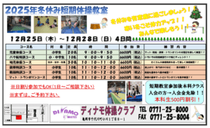 2025.11.05 2025年冬休み短期教室受付開始! 12月25日(木)~28日(日)の4日間で短期教室を行います。 詳しくはこちら↓ 受付はお電話にてお願い致します。 0771-25-8000 日割りでの参加も可能です。 ご参加お待ちしております!
